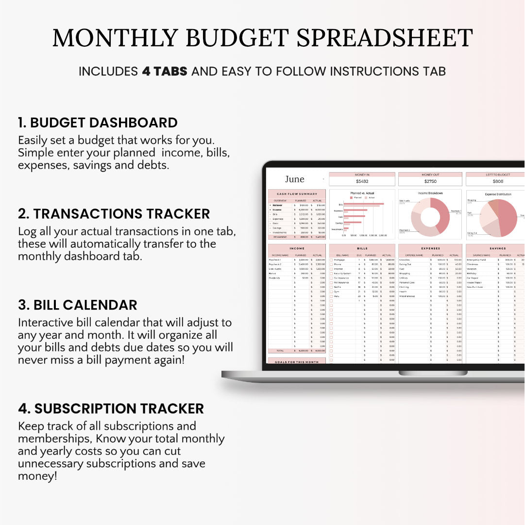 ✓ Monthly Budget tab: Easy-to-use Monthly Budget dashboard including an easy way to track your bills (check off column included!)